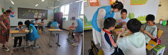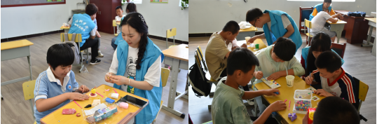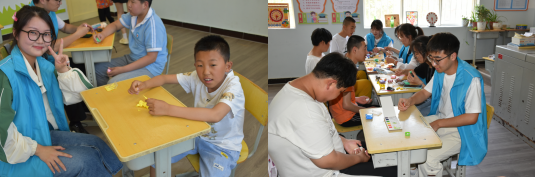 特殊教育公司罗星老师对志愿者同学的到来表示欢迎和感谢,并介绍了集团建校史、办学理念、员工状况以及获得荣誉等情况,也希望和公司志愿服务团队形成长期合作关系。交流结束后,18名志愿者分为4个组,进入四个班级陪伴孩子们进行娱乐,教导活动,针对特殊儿童的情况,志愿者陪伴孩子们做手工,拼图、绘画等活动,锻炼孩子们的动手能力。在老师和志愿者的鼓励和引导下,孩子们体验到游戏带来的乐趣,教室里不时传出欢声笑语。