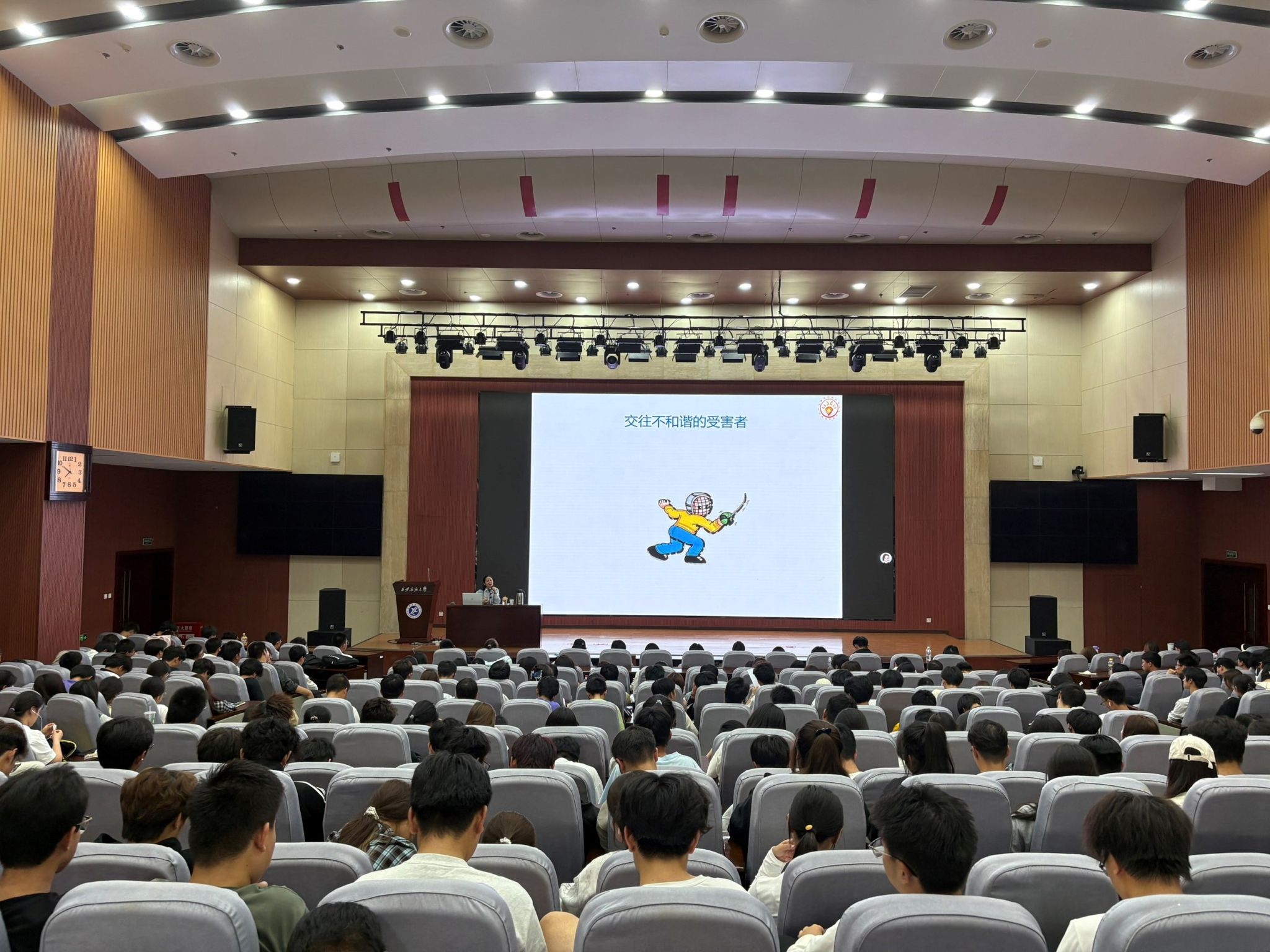 讲座在轻松活泼的互动中拉开帷幕。肖老师以“拍拍肩、拉拉手、吼一吼”的破冰游戏打破陌生感,迅速点燃现场气氛。同学们在欢声笑语中拉近距离,报告厅内暖意流动,为整场讲座奠定了开放而温暖的基调。肖老师从老员工活的日常场景切入,围绕“课堂占座”“图书馆互助”“观点讨论”等真实情境,生动讲述了同窗情谊对个人成长的重要意义。她指出,大学不仅是知识的殿堂,更是人际交往能力提升的关键阶段,良好的同伴关系是大学四年中最珍贵的“成长礼物”。