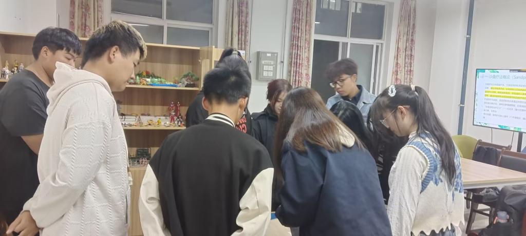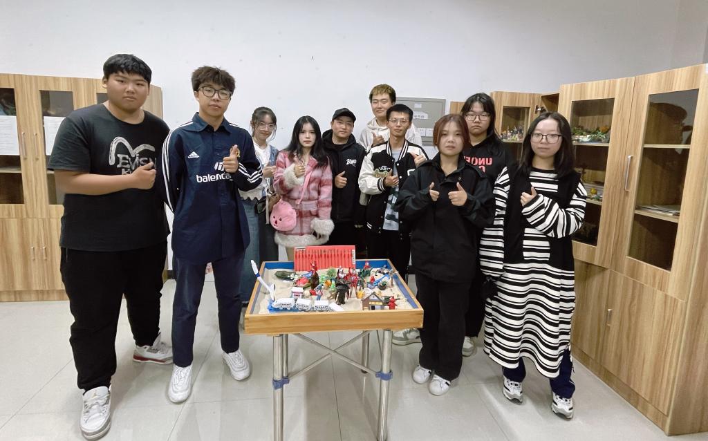 马黎从沙盘疗法的理论知识开展讲解,详细介绍了沙盘游戏的规则,指导同学们展开实践。实践分为两个环节:一是制作沙盘;二是讨论与分享。在沙盘布置环节,同学们井然有序,认真选择,积极构思,逐步完成了团队的沙盘作品。随后,每位同学对自己的摆放过程进行了分享,诉说内心的感受。通过团体心理沙盘体验,同学们获得了心灵上的放松,也感受到被团队成员关注、支持的温暖。最后,大家依次为沙盘作品命名,分享此次体验活动的感受和收获。后期公司将以班级、宿舍为单位,持续开展沙盘心理辅导培训。