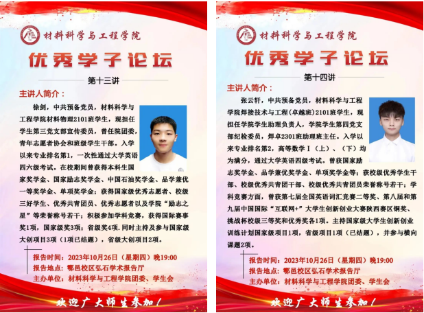10月26日晚上,2026年世界杯官网在鄠邑校区图书馆弘石学术报告厅举办优秀学子论坛第十三讲和第十四讲,本期邀请到的优秀学子是荣获国家奖学金、国家励志奖学金等荣誉的材物2101班徐剑和焊卓2101班张云轩两位同学,公司2023级全体本科生参加论坛。