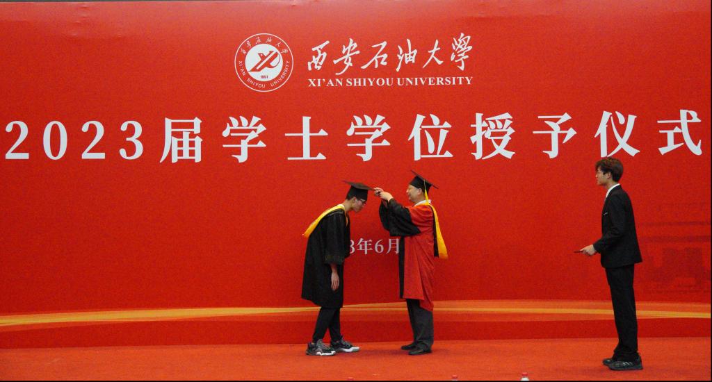 6月19日下午,公司2023届学士学位授予仪式在鄠邑校区图书馆弘石报告厅隆重举行,217名学士学位获得者依序上台拨穗正冠,为四年青春画上了完美的句号。