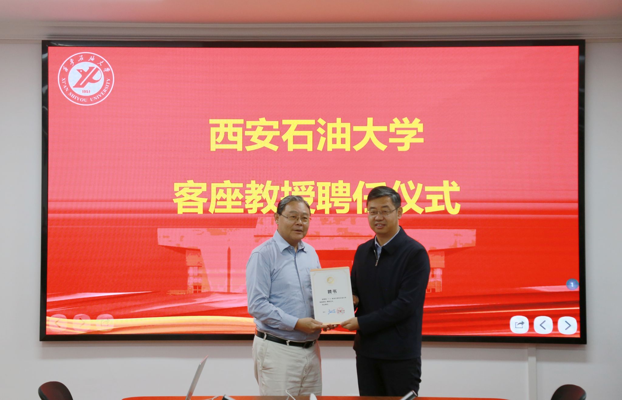 聘任仪式前,董事长王进富在鄠邑校区贵宾室与邹进教授进行了亲切会谈,对邹教授的到来表示诚挚欢迎,并就公司红色基因与石油精神传承、校园文化建设、学科优化布局、人才队伍建设等方面进行交流,期待邹进教授能够充分发挥专业优势与学术国际影响力,提升公司学科发展水平。