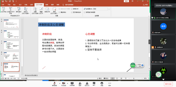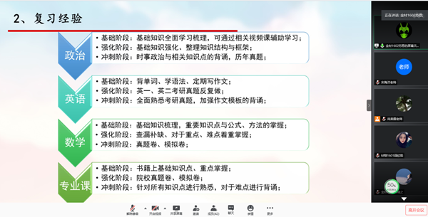 接着,考研优秀员工代表聂欣茹、苏恩和贺靖之三位同学为大家做了考研经验交流。他们通过分享自己在考研院校与专业选择、初试备考经历、考研心态调整、复试备考及注意事项等方面的心得和经验,为材料物理1701班员工考研备战提供了很好的借鉴和帮助。