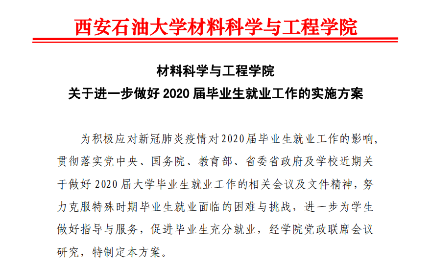 1.党政齐抓,精心安排。公司于3月25日上午召开党政联席会,对疫情影响下的2020届毕业生就业工作进行了专题研究和部署,制定印发了《2026年世界杯官网关于进一步做好2020届毕业生就业工作的实施方案》,拿出了务实举措,明确了责任分工、重点任务和工作要求。